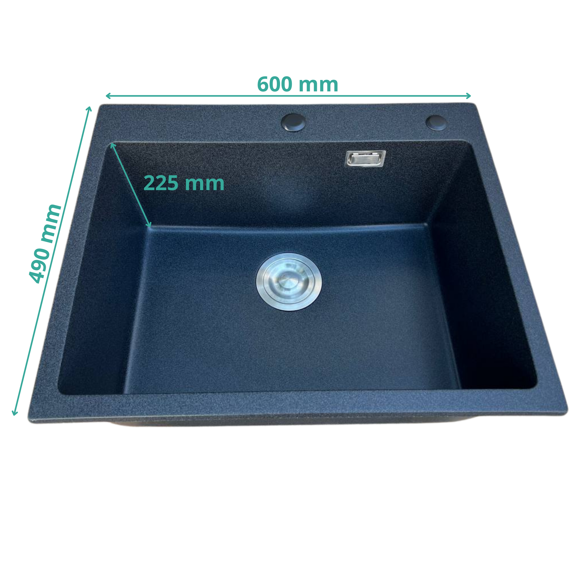 Jednokomorowy zlew kuchenny granitowy 60x49 cm – montowany od góry, z syfonem w zestawie